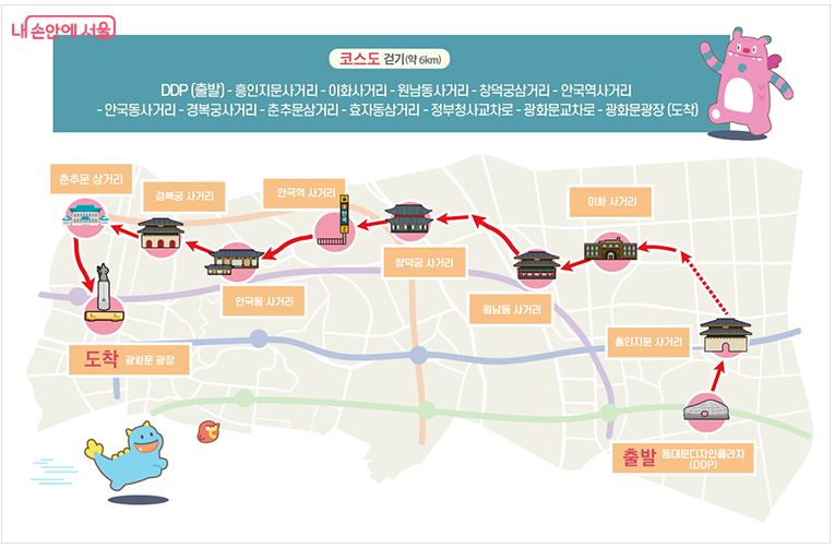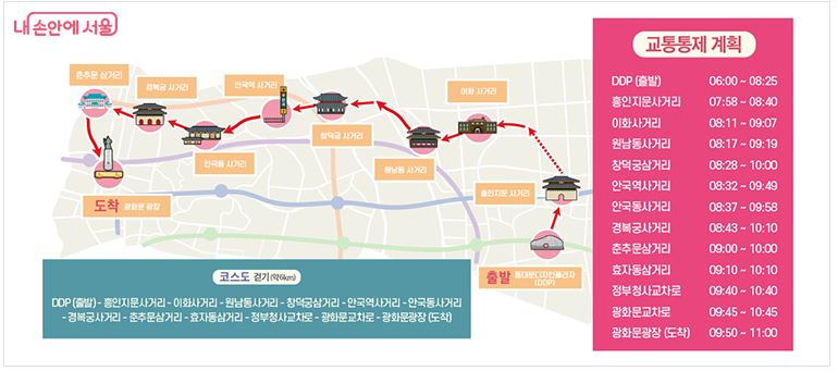 ○ 주요코스 : DDP→ 흥인지문→ 율곡터널→ 경복궁사거리→ 청와대로→ 청와대사랑채→ 광화문광장
