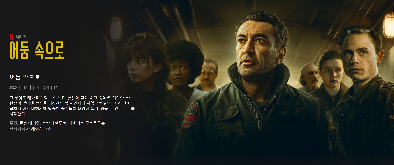 "어둠 속으로"는 갑작스럽게 발생한 태양의 이상 현상으로 시작됩니다. 태양이 모든 생명체를 죽이는 재앙을 일으키게 되면서, 생존자들은 살아남기 위해 밤을 피해 비행기로 이동합니다. 비행기는 브뤼셀에서 출발해 서쪽으로 이동하며, 태양을 피하려고 시도하는 승객들과 승무원들이 다양한 갈등과 생존을 위한 협력을 경험하게 됩니다. 시리즈는 이들이 서로의 과거와 비밀을 알아가며, 끊임없이 다가오는 태양의 위협을 어떻게 극복할지 고민하는 과정을 그립니다.