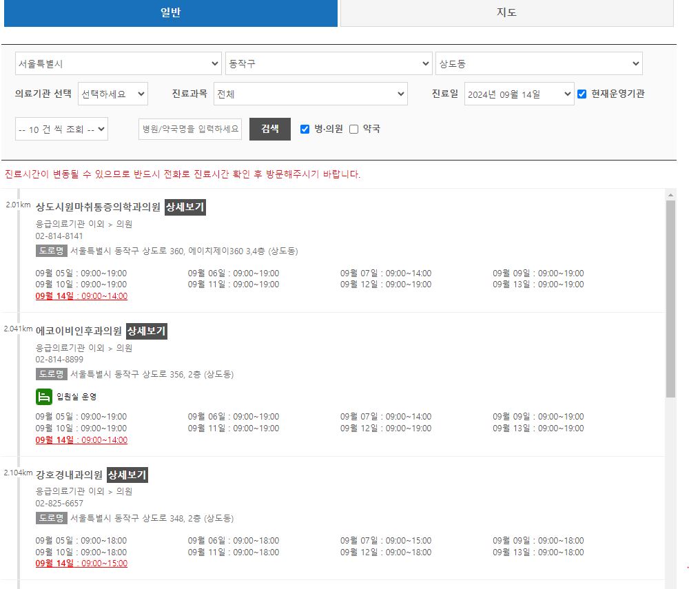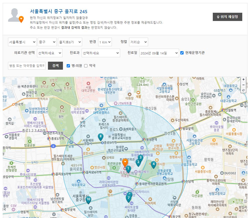 주소지를 검색해서 인근 진료 병원을 볼 수 있으며, 지도를 통해서도 검색이 가능하다