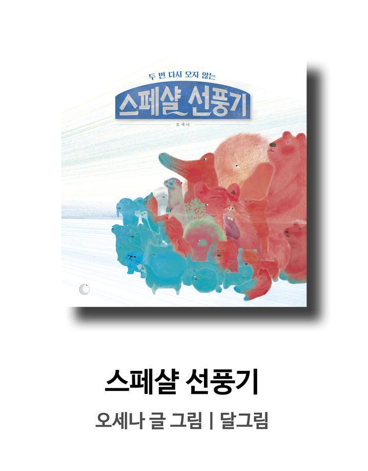 올 여름, 정말 너무 더웠죠? 더위는 인간뿐만 아니라 동물에게도 고통을 줍니다. 이 책에서 작가는 찜통더위 속 동물들을 위한 스페샬한 물건을 등장시키죠. 바로 파란색 옛날 선풍기가 '다쓸어부러우웅후후'하면서 더위를 열심히 물리치고 나자 숨막히게 새빨갛던 숲은 알록달록 아름다운 모습으로 바뀌네요. 선선한 가을이 왔습니다. 그런데, 내년에도 동물들은 이 스페샬한 선풍기를 만날 수 있을까요?