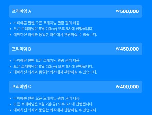 프리미엄 A, B, C의 경우 경기 전 오픈 트레이닝 티켓 가격 포함이기에 따로 오픈 트레이닝 티켓 예매를 안 해도 됩니다.