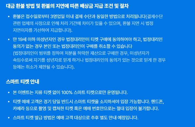 - 휠체어석 예매 티켓은 현장 수령만 가능. 경기 당일 예매자 본인(휠체어석 이용자)이 직접 티켓을 수령 (대리수령 및 양도 불가)
