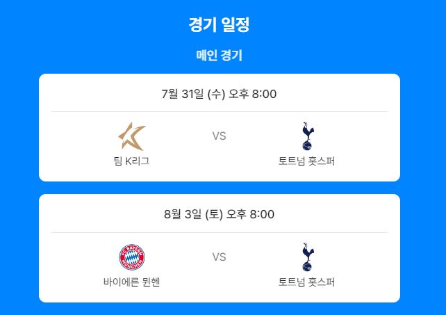 2024년 7월 31일 (수) 오후 8시 팀 K리그와 토트넘의 축구 경기에 이어 8월 3일 (토) 오후 8:00 김민재선수가 속해 있는 바이에른 뮌헨 vs 손흥민선수가 속한 토트넘 홋스퍼의 경기가 서울 월드컵경기장에서 있습니다.