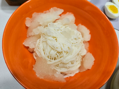 1. 탱글한 소면을 먹기 좋게 그릇에 담는다.