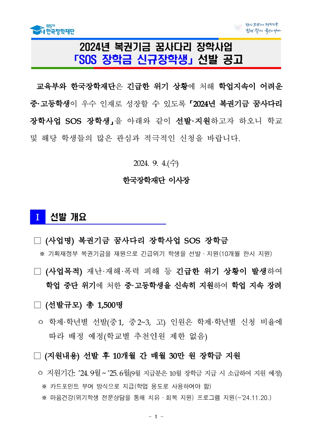2024년 복권기금 꿈사다리 장학사업 「 SOS 유형 」 신규장학생 선발 공고