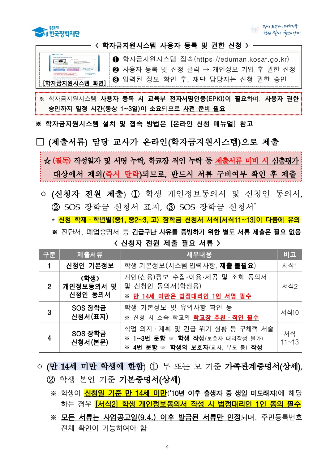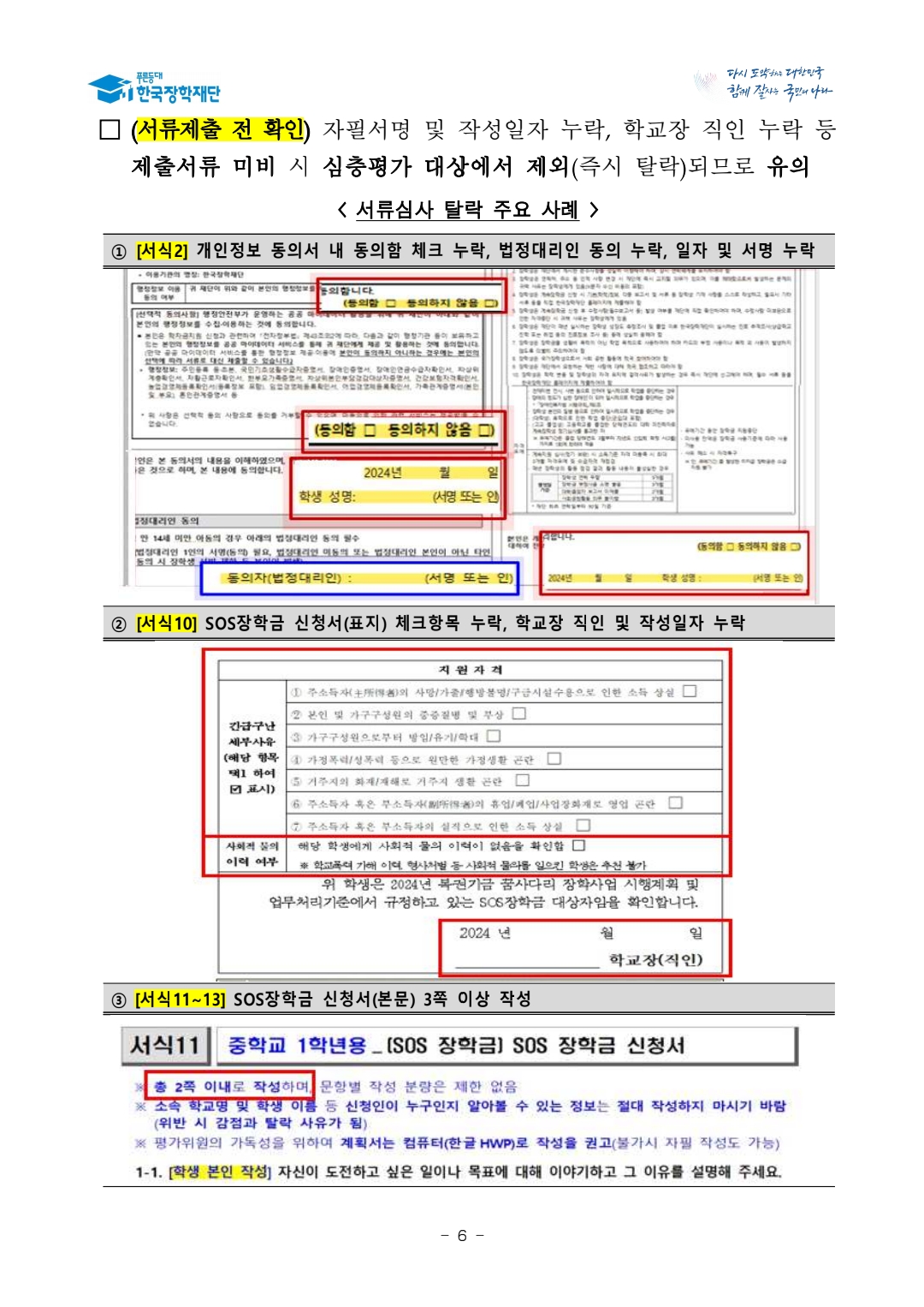 (신청자 전원 제출) ① [서식2] 학생 개인정보동의서 및 신청인 동의서, ② [서식10] SOS 장학금 신청서(표지), ③ [서식11~13 중 해당 서식] SOS 장학금 신청서(본문)
