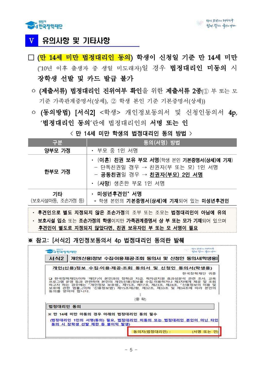 ※ 학생이 신청일 기준 만 14세 미만(’10년 이후 출생자 중 생일 미도래자)에 해당하는 경우 [서식2] 학생 개인정보동의서 작성 시 법정대리인 1인 동의 필수