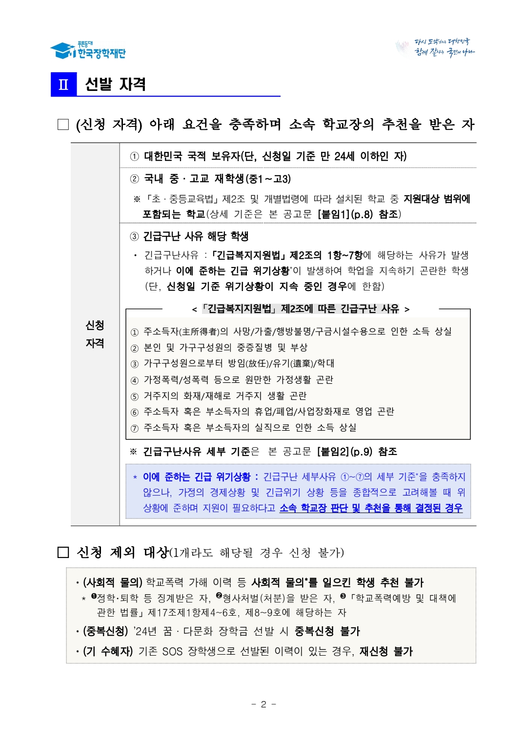 대한민국 국적을 가지고 국내 중학교* 또는 고등학교*에 재학 중인 긴급구난사유** 해당 학생으로 만 24세 이하에 해당하는 자