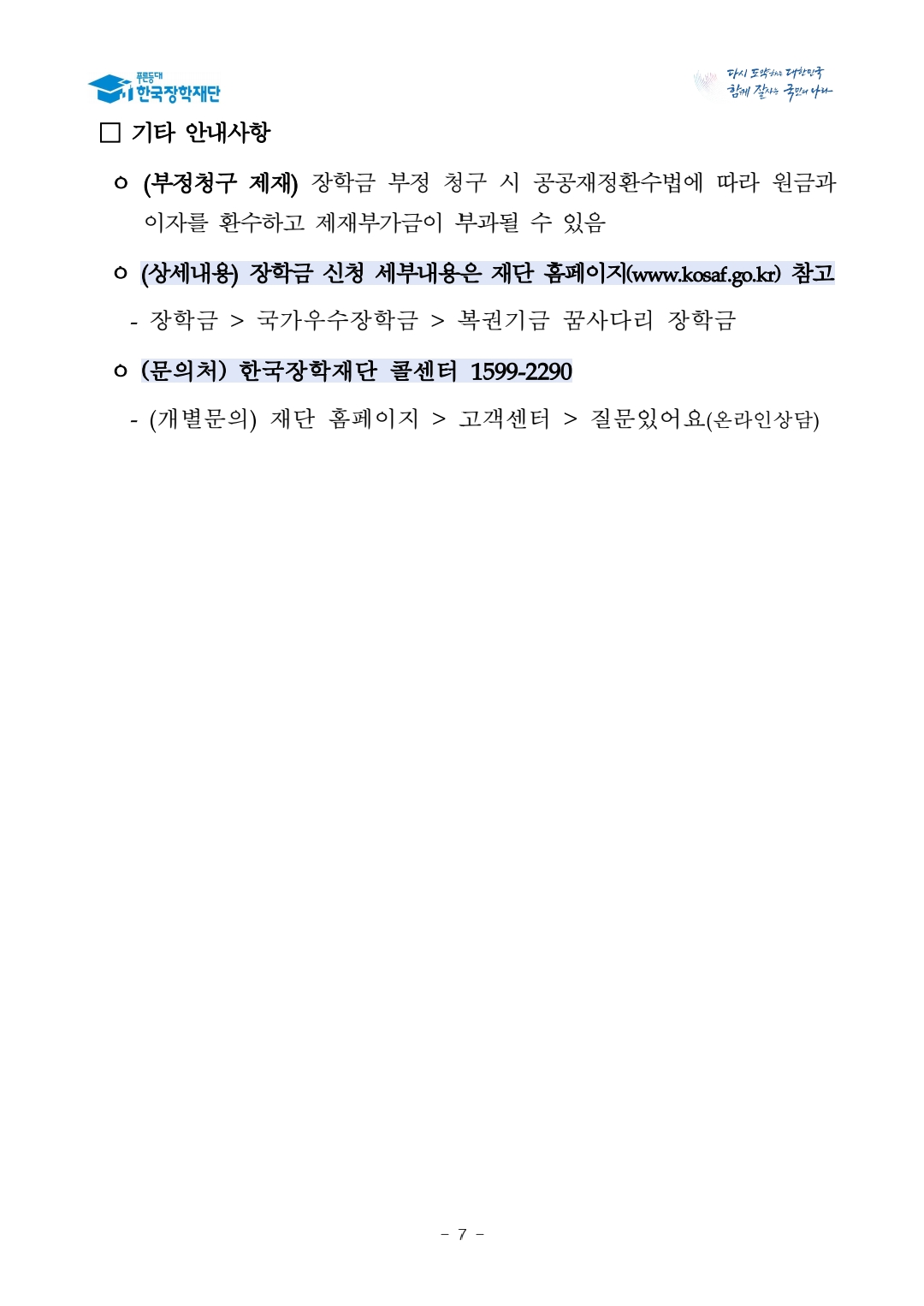 □ (문의처) 한국장학재단 콜센터 1599-2290